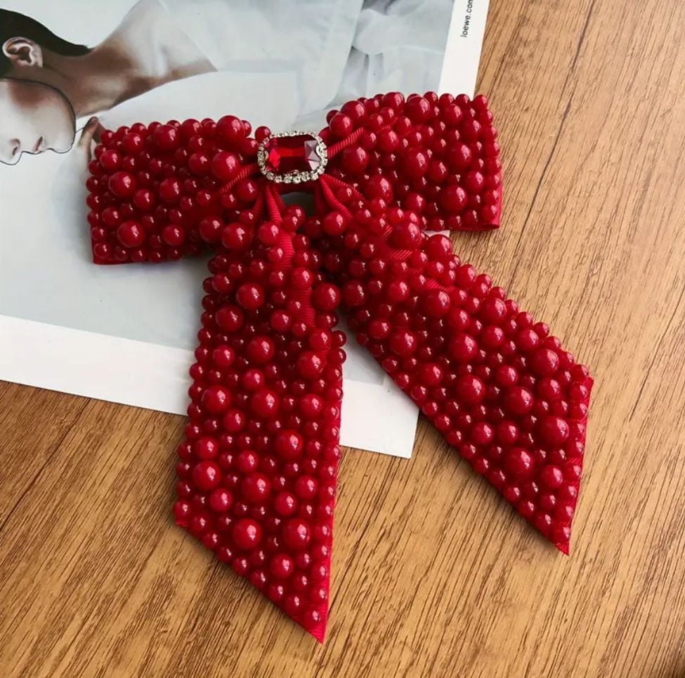 İnci İşlemeli Kırmızı Kurdele Saç Tokası
